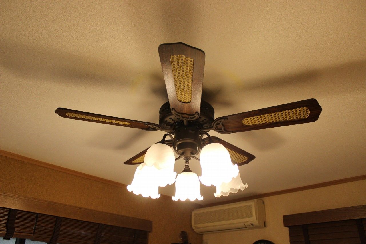 設置後、シーリングファンのシャンデリアライト5灯でパッとお部屋が照らされて、