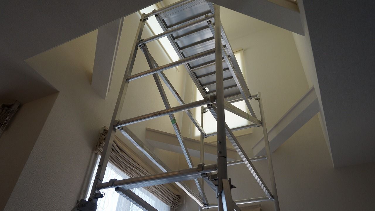 通常4mを超える天井高ですと、8尺(2.4mくらい)の脚立の搬入は難しいので組立足場の工事となります。