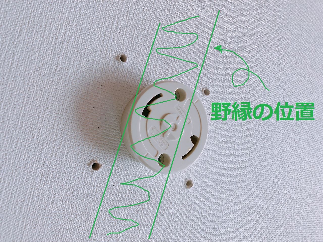 一般的な造りの場合は、配線器具の近くに野縁は入っているはずと天井をチェックすると、、、やはりしっかり4cmくらいの野縁が入っておりました。